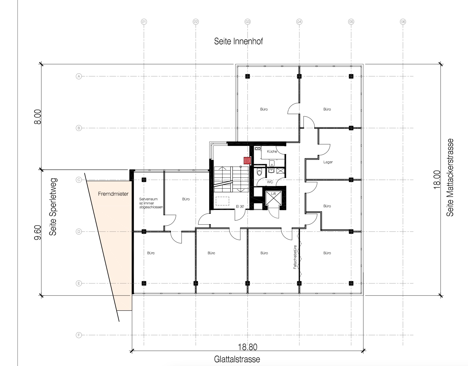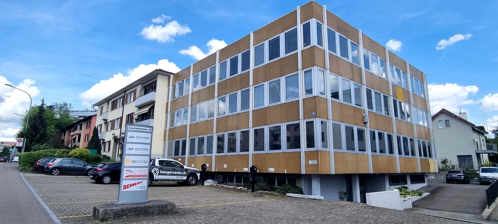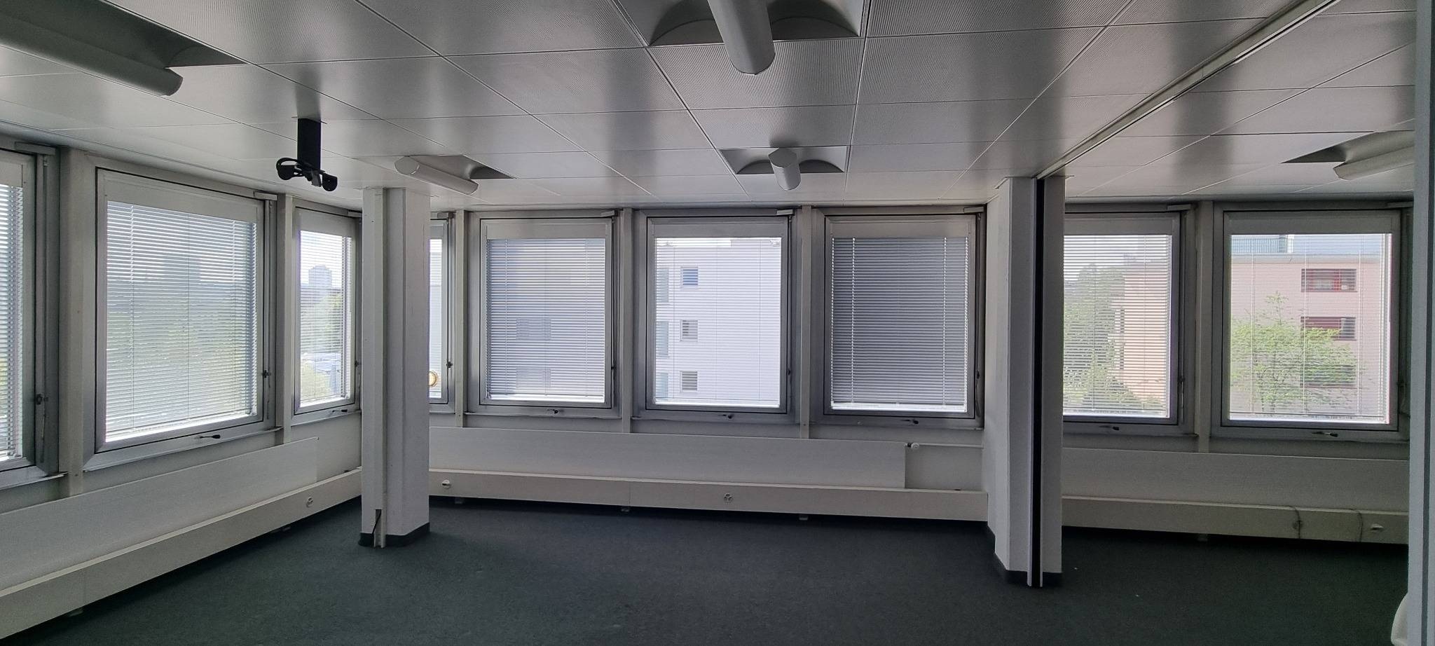 of the commercial building at Glattalstrasse 18 in Zurich. - The spaces are offered in shell construction with large, light-filled window fronts,